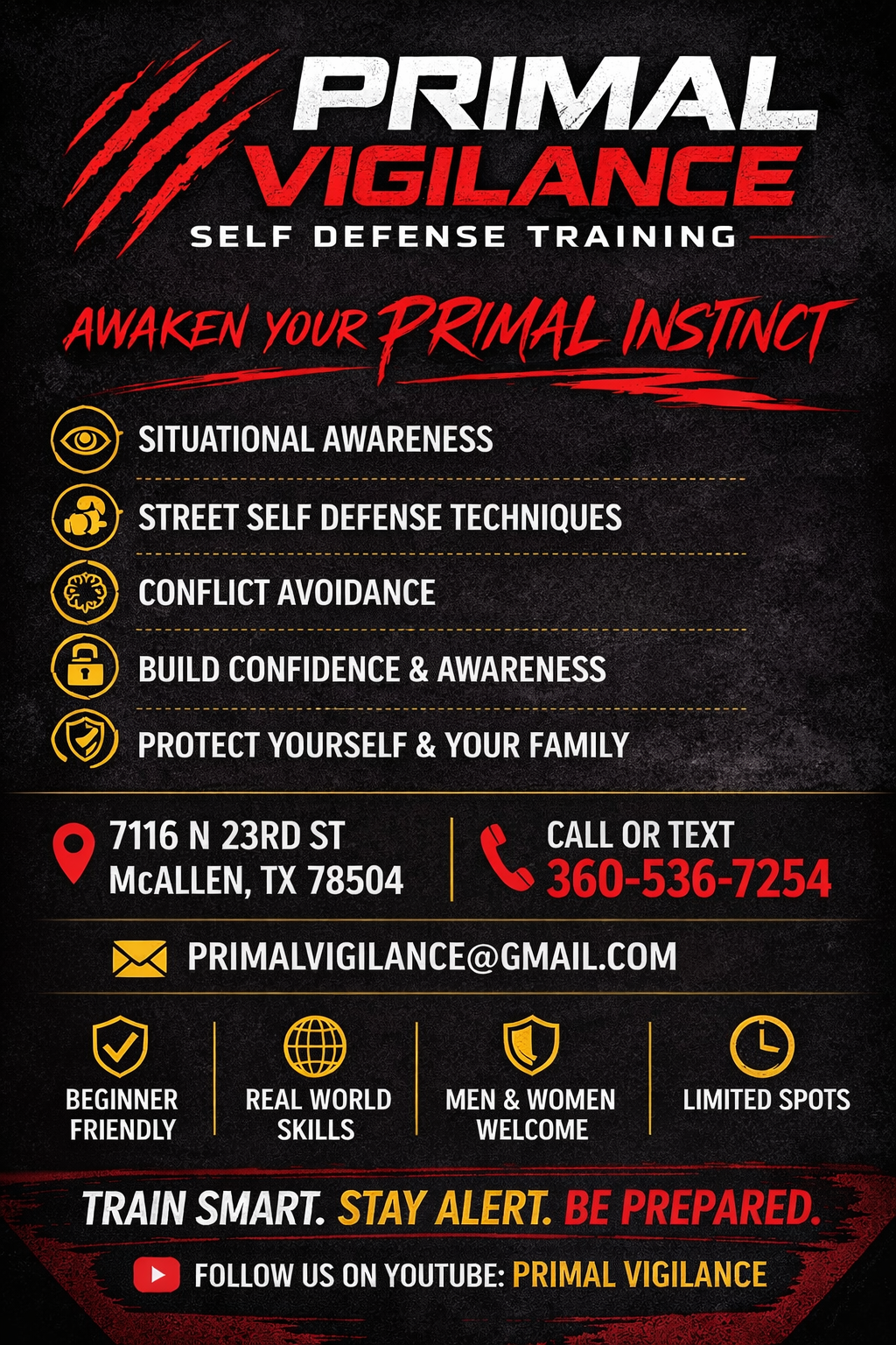 Primal Vigilance is dedicated to empowering individuals with the skills, mindset, and awareness needed to protect themselves and those around them. Through practical self-defense training, situational awareness education, and hands-on instruction, Primal Vigilance helps people develop confidence, preparedness, and the ability to respond effectively in real-world situations. Our mission is to awaken the instinct to stay alert, stay prepared, and stay safe.